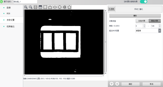 步骤二:使用“预处理”算子,选择手动二值化工具,将灰度图像转换为黑白二值图像。打开设置参数界面,如图3所示,可以设置参数。