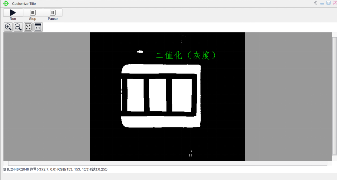 对单通道灰度图像进行二值化处理,将灰度图像只转换为黑白二值图像。图像的灰度分为从低(黑色)到高(白色)的256个等级,即[0,255]。设置参数时,灰度。在高阈值和低阈值之间的像素组成目标区域(在界面中,用绿色标记的区域),其余为背景区域。